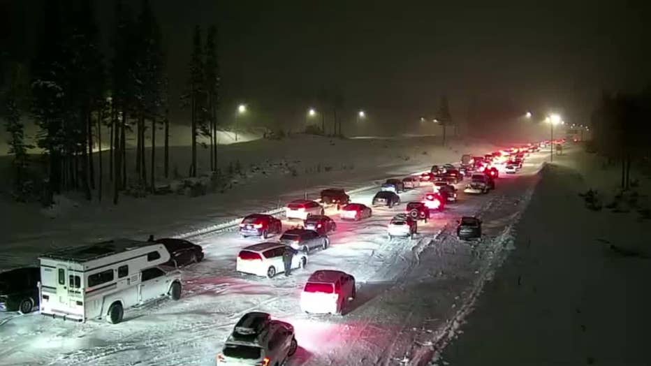 Traffic was halted temporarily in both directions on I-80 near the Nevada state line due to spinouts and crashes, the California Department of Transportation reported.
