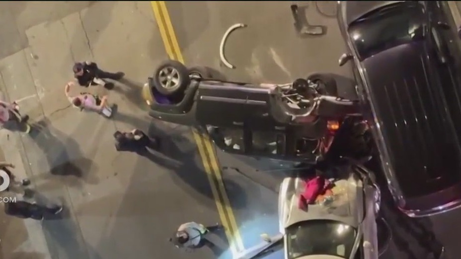 Suspect vehicle hits parked cars, flips on side in San Francisco.