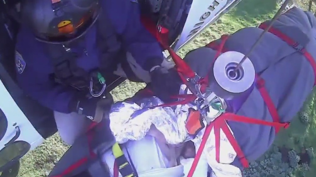 BIG SUR, Calif. - The California Highway Patrol rescued a 19-year-old who fell 200 feet while hiking near Big Sur and shared video of the agency's helicopter hoisting him out of the woods on a gurney.