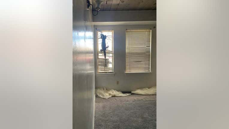 A 7-foot ornate Nile monitor, a type of lizard, climbs the window inside an abandoned Alameda home. Photo: Alameda police
