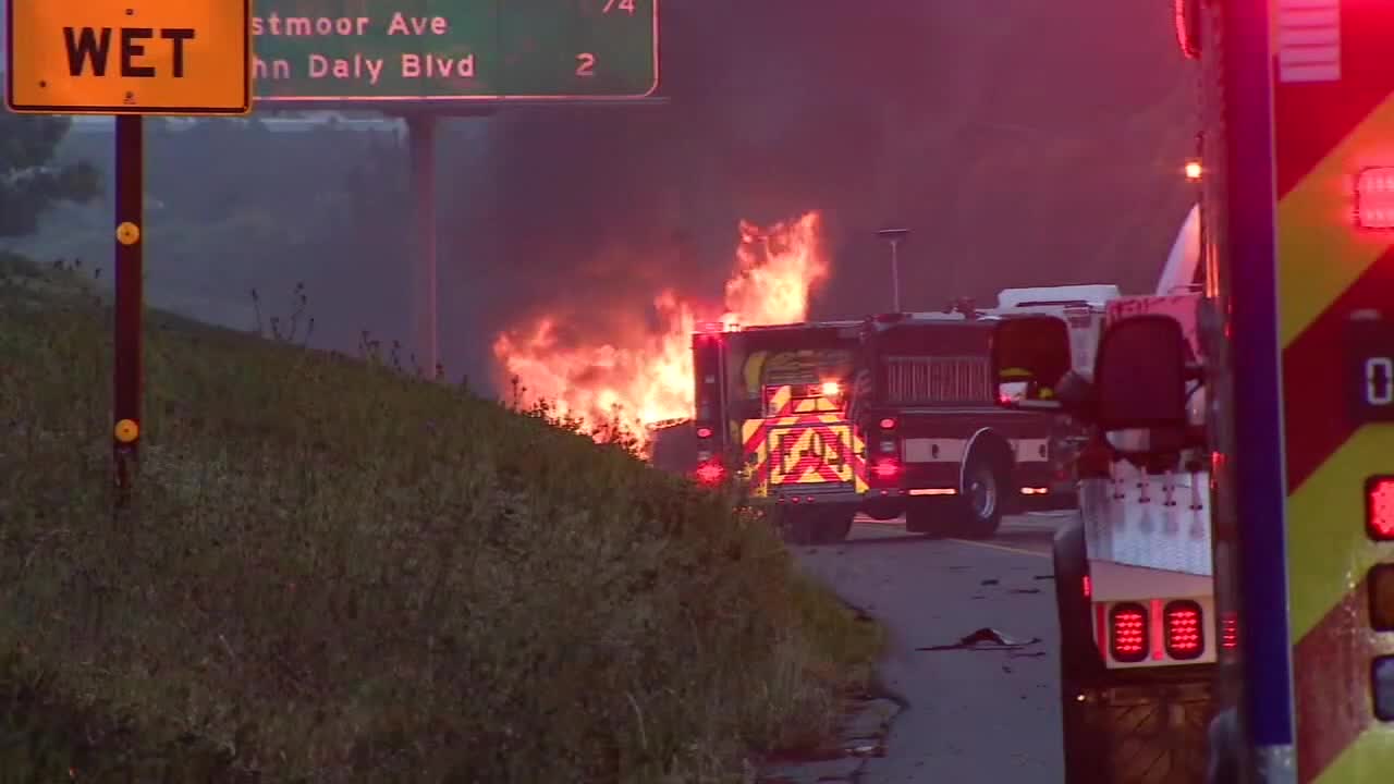 Tesla engulfed in flames shuts down part of I-280 in Daly City