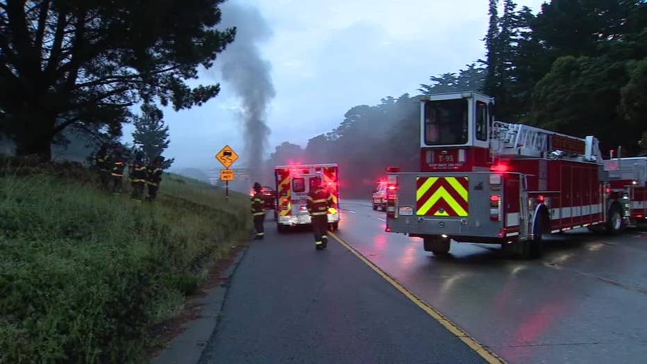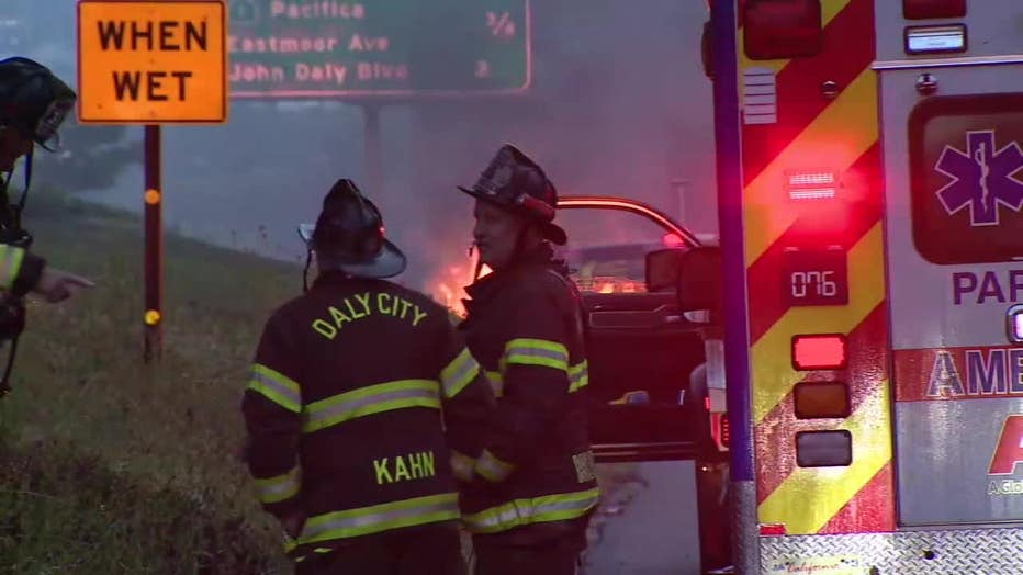 DALY CITY, Calif. - A Tesla Model Y engulfed in flames shut down a portion of northbound Interstate 280 in Daly City on Tuesday morning, prompting fire crews to race to put out the blaze in about an hour.