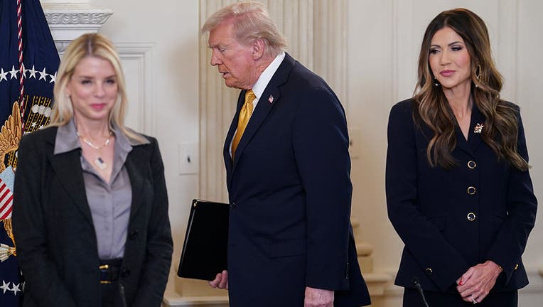 Pam Bondi, US attorney general, from left, US President Donald Trump, and Kristi Noem, secretary of the US Department of Homeland Security (DHS), during an announcement on the Homeland Security Task Force in the State Dining Room of the White House i