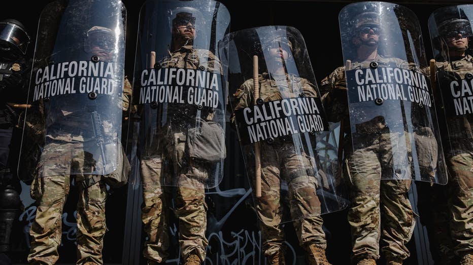 LOS ANGELES, CALIFORNIA - JUNE 09: National Guardsmen stand outside of the Edward Roybal Federal Building on June 9, 2025 in Downtown Los Angeles, California. Tensions in the city remain high after the Trump administration called in the National Guar