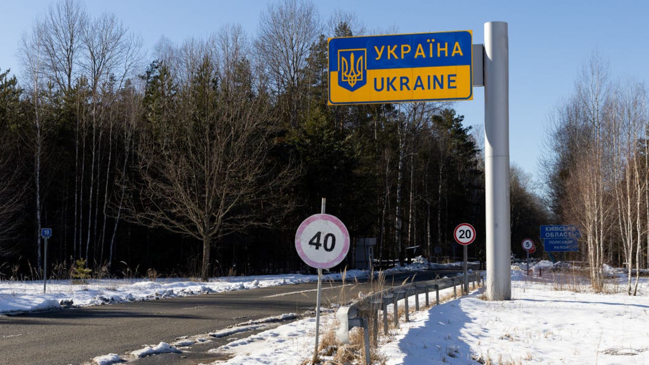 A sign showing the entrance to Ukraine is seen at the Ukraine-Belarus border crossing on February 13, 2022 in Vilcha, Ukraine. (Photo by Chris McGrath/Getty Images)