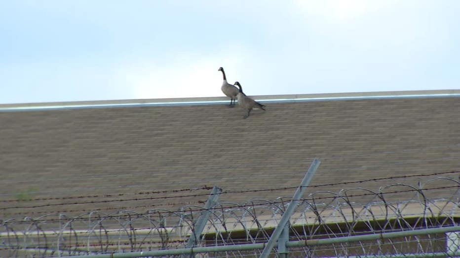 Geese walk on top of a roof at the shuttered FCI Dublin prison. April 7, 2026