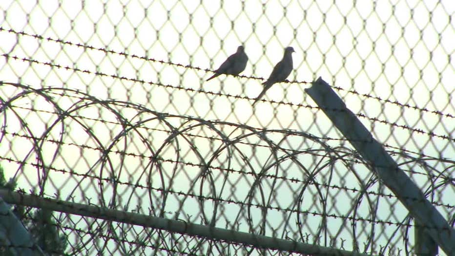 Birds sit atop a barbed wire fence at the shuttered FCI Dublin prison on April 7, 2026