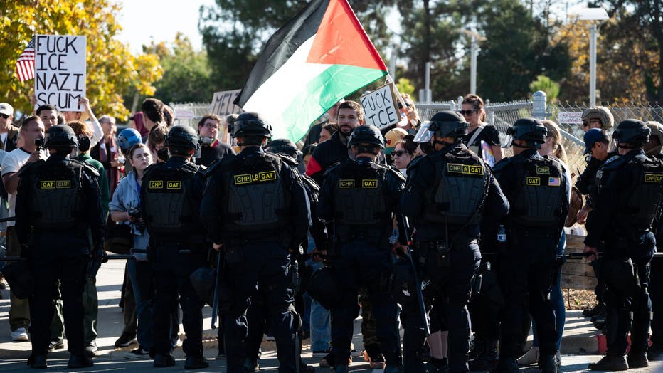 Dozens of California Highway Patrol officers donning riot gear faced off with demonstrators protesting against a surge of federal immigration officers in the Bay Area at the entrance to Coast Guard Island in Oakland, Calif., Thursday, October 23, 202