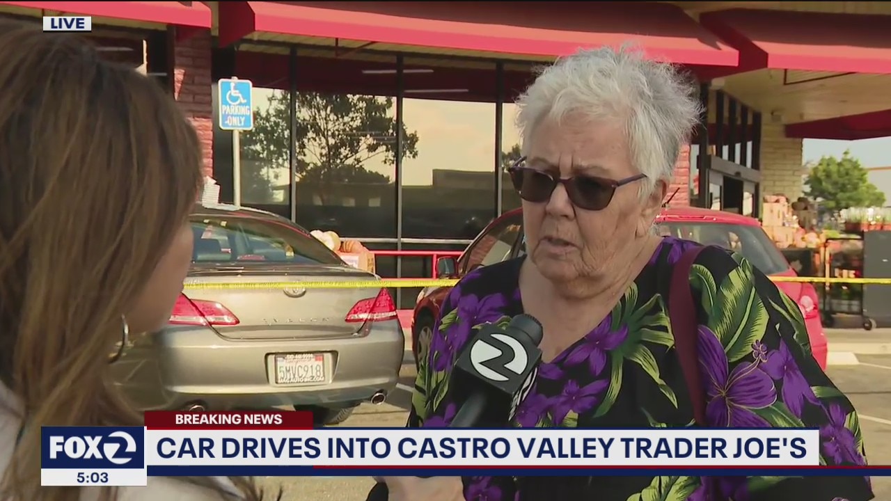 Breaking news-I spoke with a woman who witnessed a man crashing his car into the Castro Valley Trader Joe's Thursday afternoon. She says another customer's help prevented her from being hit by the car but several people were injured including a boy.
