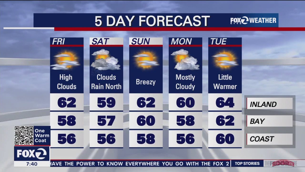 Temperatures will be cool from Friday through early next week. There is likely to be some rain in the North Bay on Saturday.