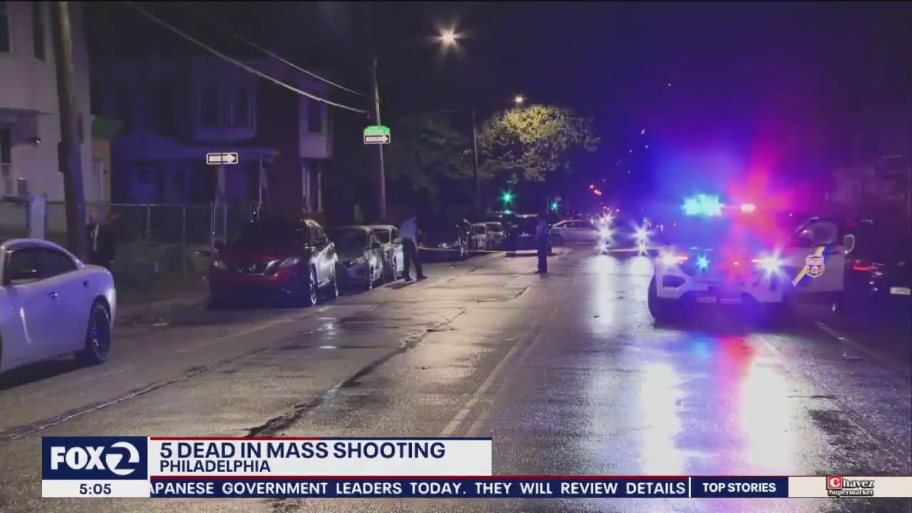 A gunman wearing a bulletproof vest is blamed for killing five people and injuring two children as he opened fire over several city blocks in Philadelphia. A 40-year-old man has been arrested and officials said it appears he fired at random.