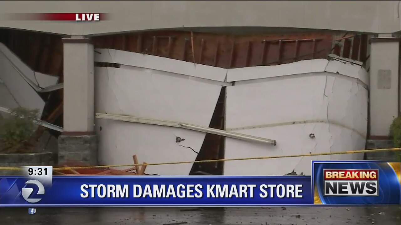 Allie Rasmus reports of storm knocking down part of roof and awning at Santa Rosa Kmart