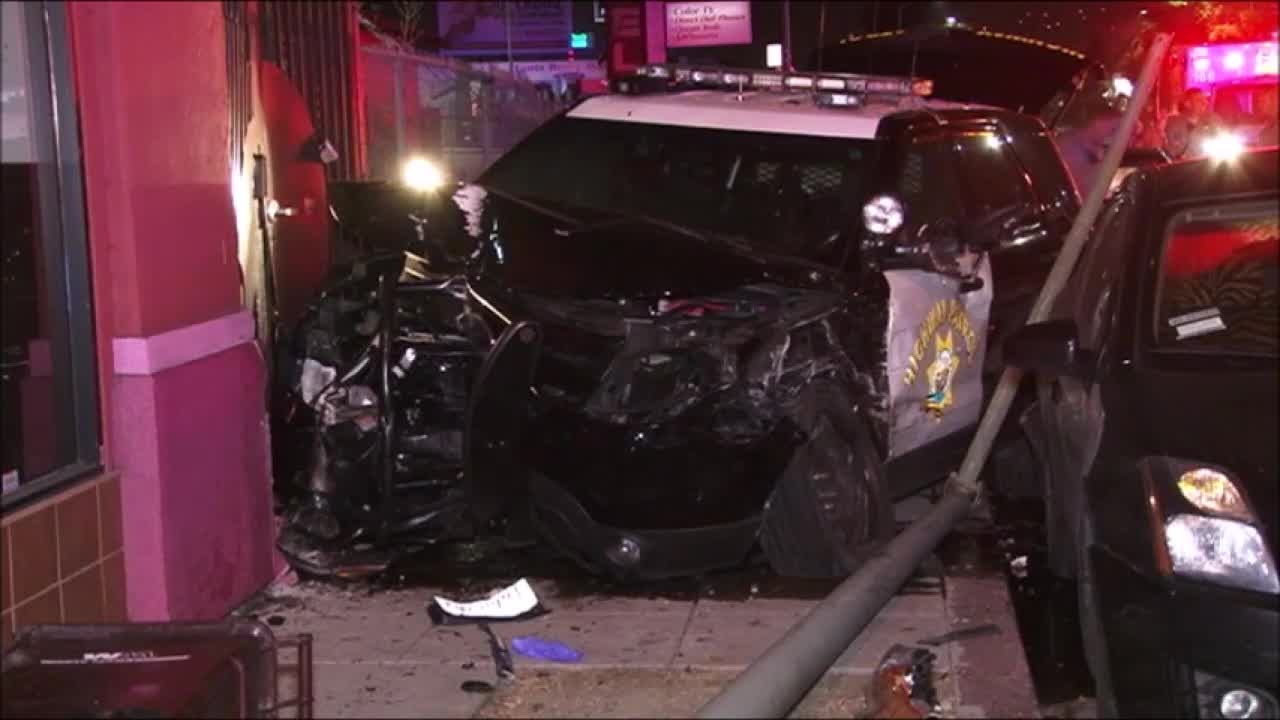 CHP cruiser hits fire hydrant and parked cars during Oakland chase