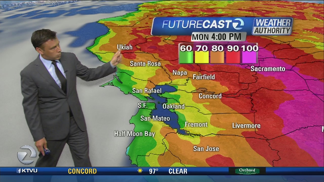 Cooler Monday forecast. Inland areas could top 100 degrees this week.