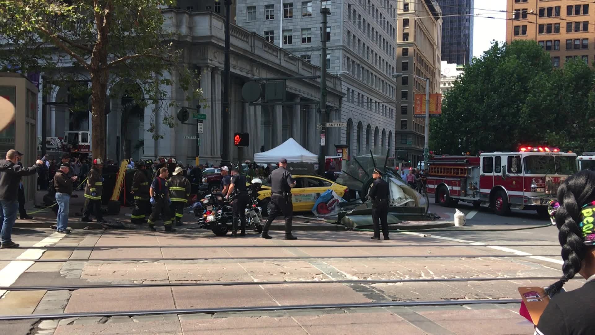 Video uploaded by Fresco user Devon Meyers after a taxi crashed into a downtown San Francisco newsstand.
