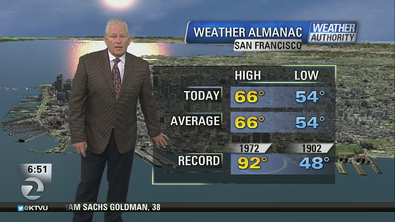KTVU meteorologist Steve Paulson said it should be 66 in San Francisco and 83 in San Jose today, with a warming trend inland through through the weekend.