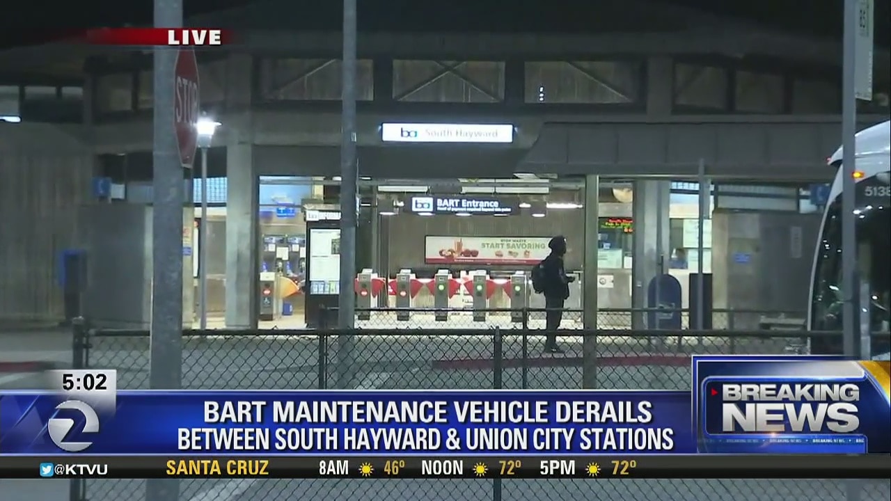 BART maintenance vehicle derails between South Hayward and Union City. Alex Savidge reports.