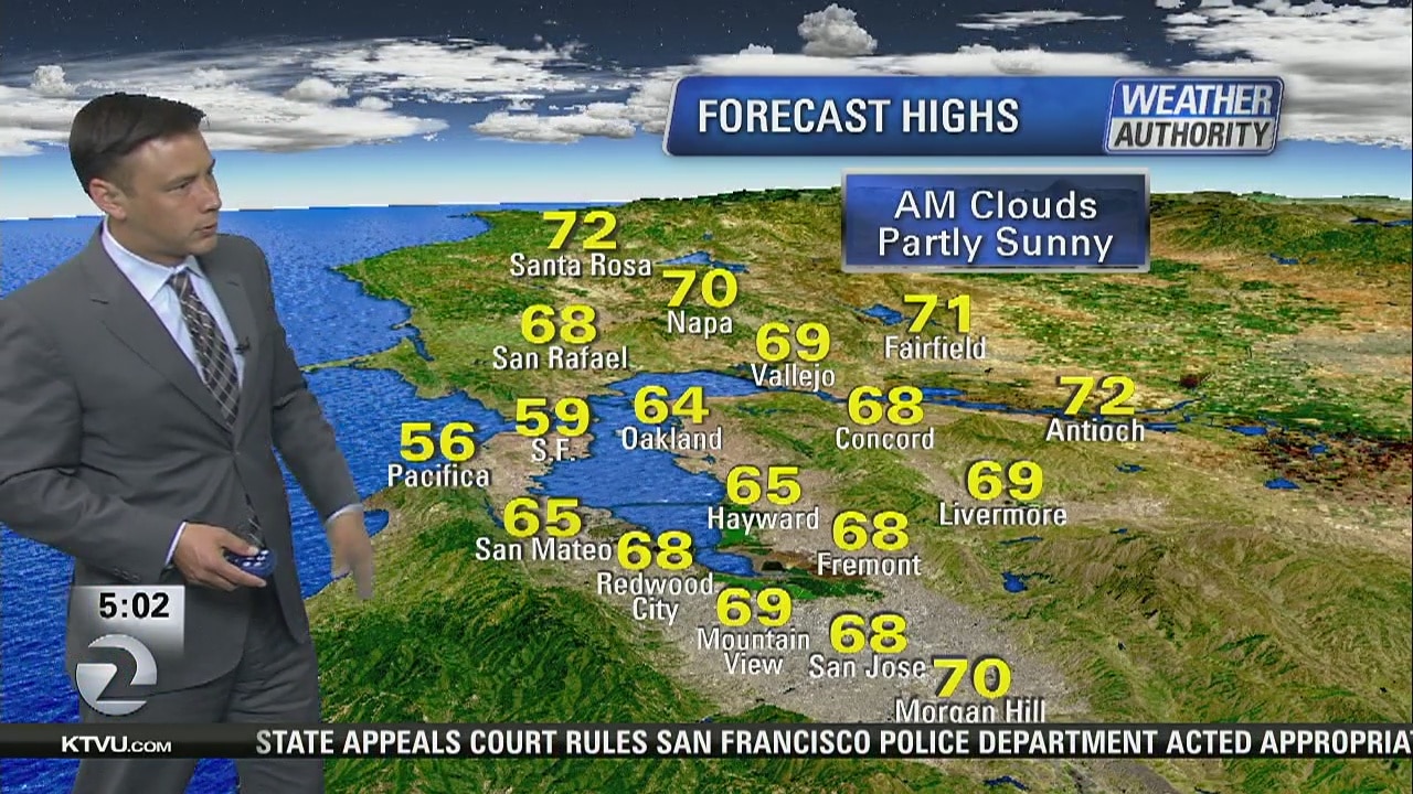 KTVU meterologist Mark Tamayo says today will be windy and have cooler temps; 50s at the coast and 60s elsewhere.