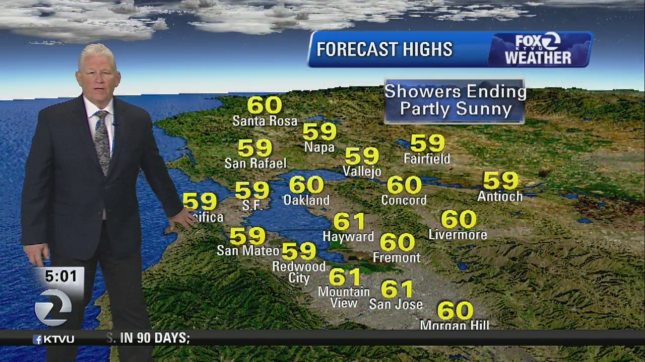 KTVU meteorologist Steve Paulson says the showers are ending the the skies will become partly sunny. Temps in the 50s and 60s.