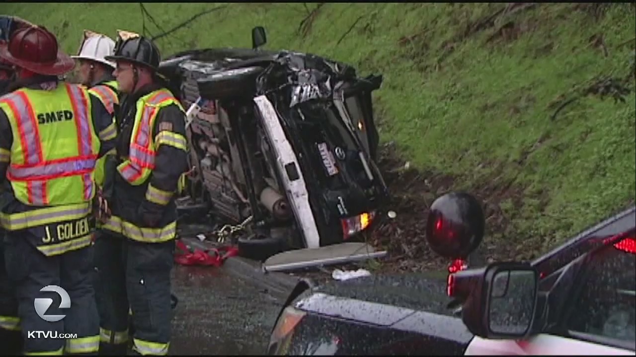 A male tow truck driver died when a Chevrolet pickup crashed into a disabled Toyota Prius on the right-hand shoulder of southbound U.S. Highway 101 Tuesday afternoon, the California Highway Patrol said. KTVU's Amber Lee reports.