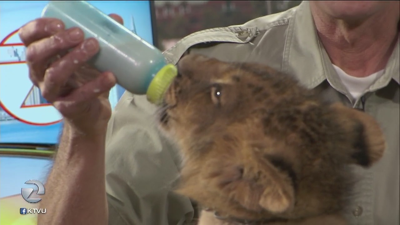 "Cain" a 3-month-old lion cub is bottle fed and burped on the 9