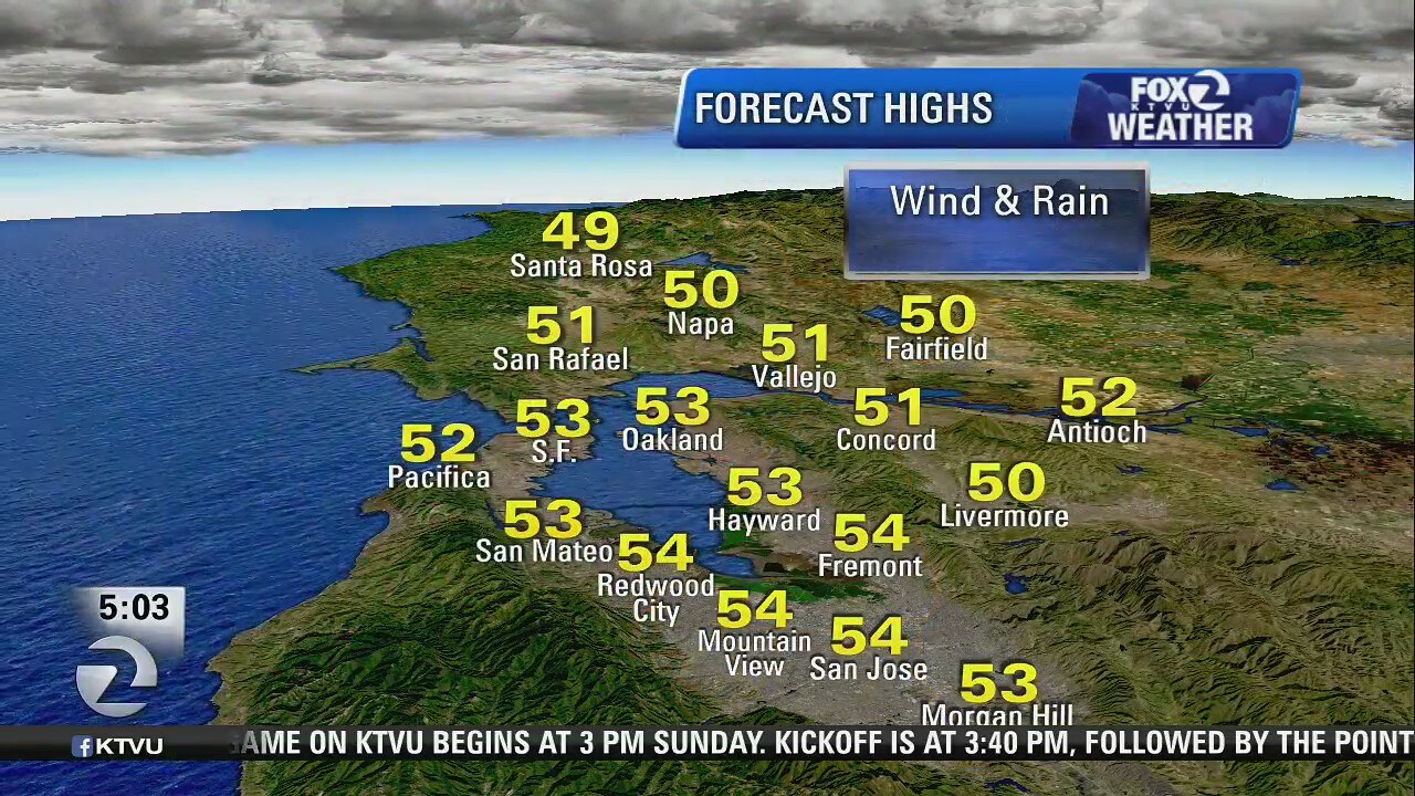 A strong storm system is spinning off the Pacific Northwest coast sending a storm and cold front through the Bay Area bringing rain, wind, high elevation snow, and a slight chance of thunderstorms.