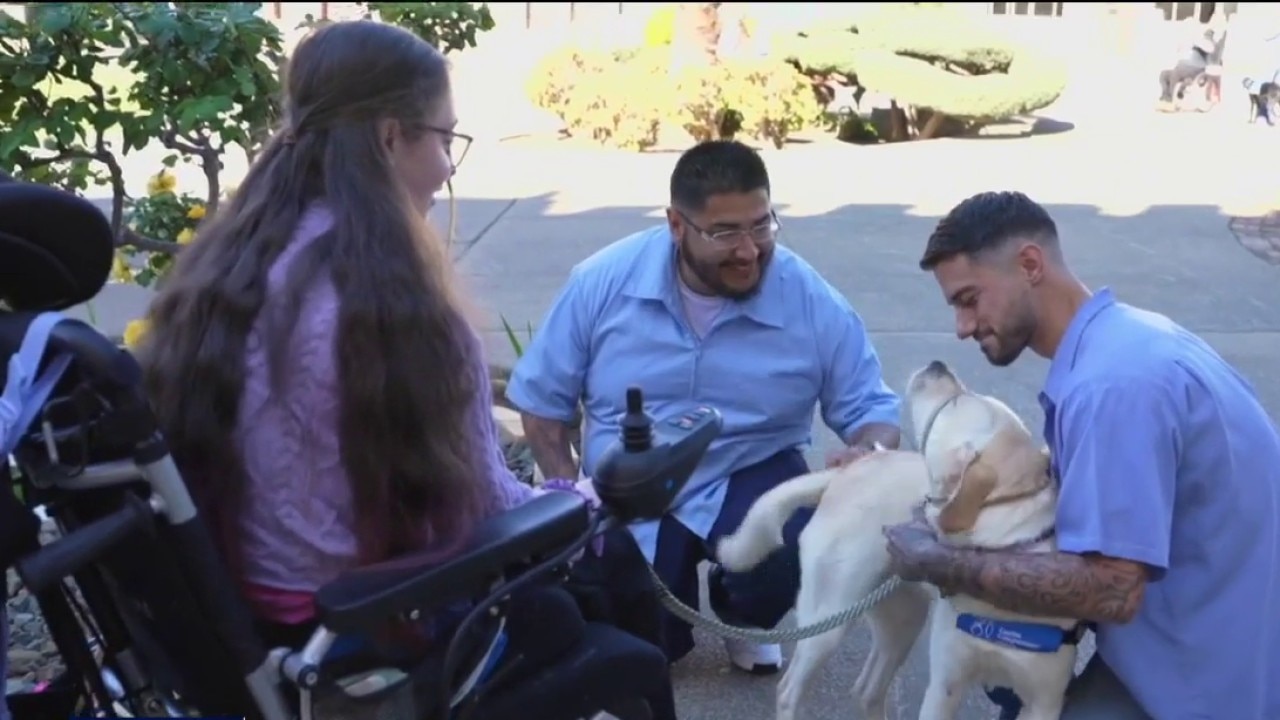 Two inmates who raised a puppy from behind the walls of San Quentin reunite with the dog - and meet the woman who lives more independently with her service animal.