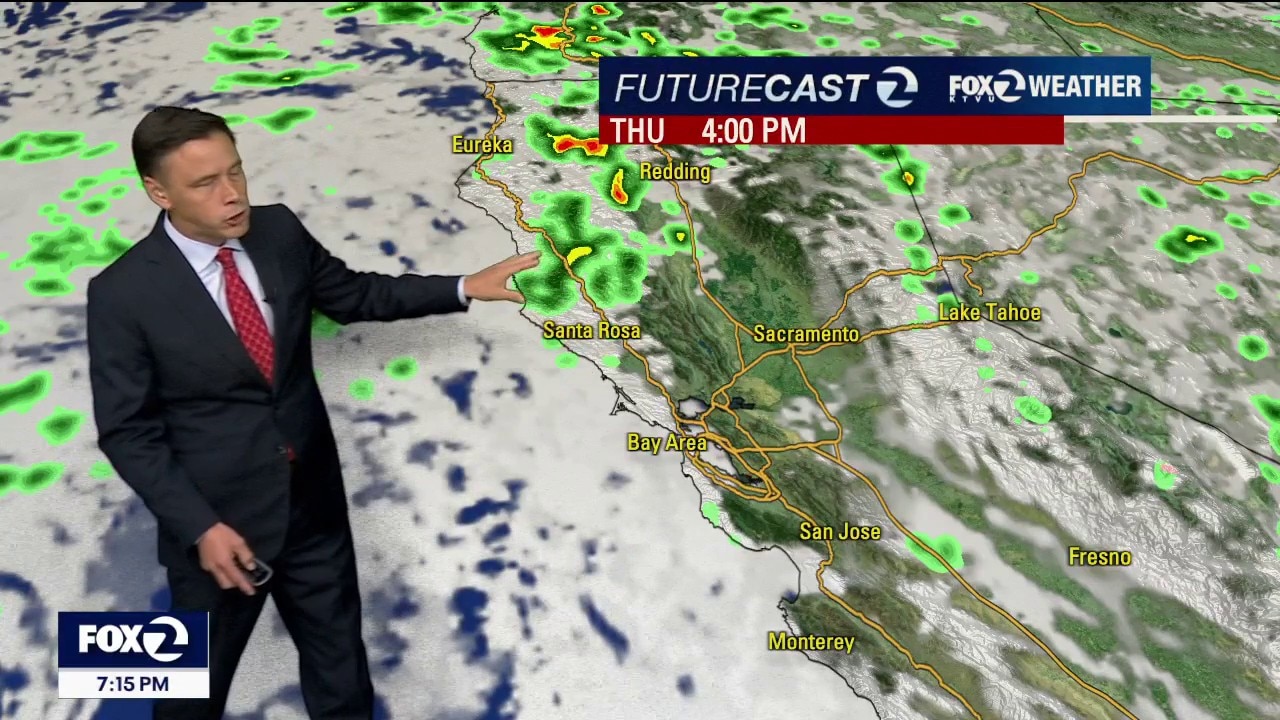 BIG changes in our weather pattern. Two systems offshore will approach our coast for the remainder of the week. Your Thursday forecast features mostly cloudy skies with the chance of showers. The activity is expected to ramp up Friday through Saturday. Thunderstorm chances have also been added to the cooler weekend forecast. This storm will also affect the Sierra. Winter Storm Watches are in effect this weekend.