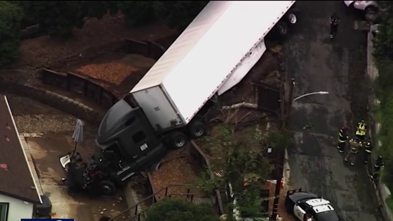 A semi-truck involved in a crash in Crockett on Monday remains at the scene where it narrowly missed crashing into a home.