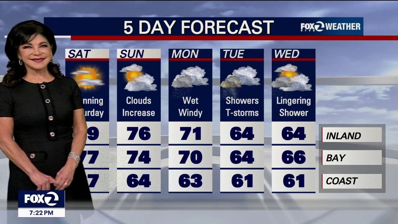 Saturday is the winner with high temperatures in the 70s and approaching 80 in Gilroy. Cooler mostly cloudy skies Sunday before rain arrives Monday.
