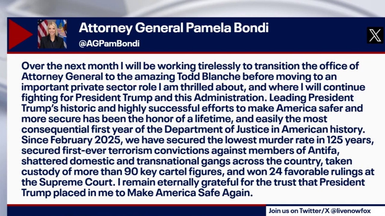 Pam Bondi released a statement Thursday after she was fired by President Trump which read in part, "Over the next month I will be working tirelessly to transition the office of Attorney General to the amazing Todd Blanche before moving to an important private sector role I am thrilled about, and where I will continue fighting for President Trump and this Administration."