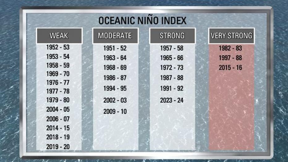 According to GoldenGate Weather Services, there have been 27 El Niños in the past.  Of those 27, there have only been four "Very Strong" El Niño events (1982-1983, 1991-1992, 1997-1998, and 2015-2016).
